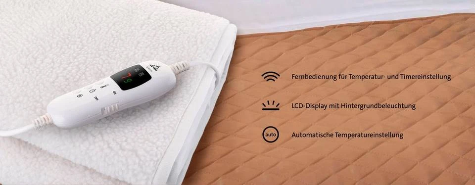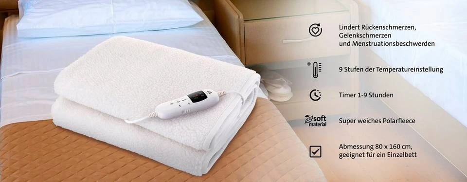 Wohl keiner von uns mag gern über längere Zeit frieren. Und wenn auch noch die Zentralheizung versagt, ist der rechte Moment gekommen für eine Heizdecke. Dieses Heizgerät fördert die Durchblutung der Muskeln nach dem Sport, beschleunigt die Regenerierung, und grundsätzlich erhöhen Sie damit merklich die Behaglichkeit und Entspanntheit zuhause. ETA Shawn 5325 90000 erbringt eine Nennleistung von 60 W. Diese Energieaufnahme wandelt das Gerät in Wärme, deren Intensität man einstellen kann in 9 Heizstufen. Sie müssen sich dabei jedoch keine Sorgen machen, dass Sie immer nur dann gewärmt werden, wenn Sie in der Nähe der Steckdose sitzen, die Heizdecke verfügt nämlich über ein Kabel mit der Länge von 2,1 m. Darüber hinaus ist es möglich zu bestimmen, wieviele Minuten oder Stunden das Gerät Ihnen einheizen soll. Zu Ihrem vollendeten Komfort erhalten Sie ebenfalls mit diesem Produkt eine Fernbedienung, daher können Sie immer Ihre angenehme Lage genießen, ohne aufstehen zu müssen .