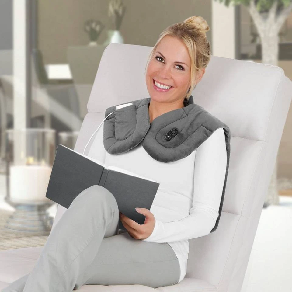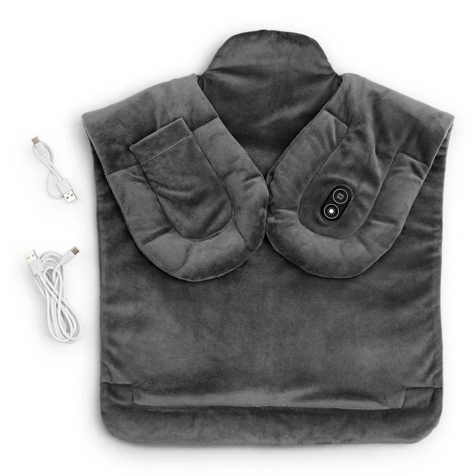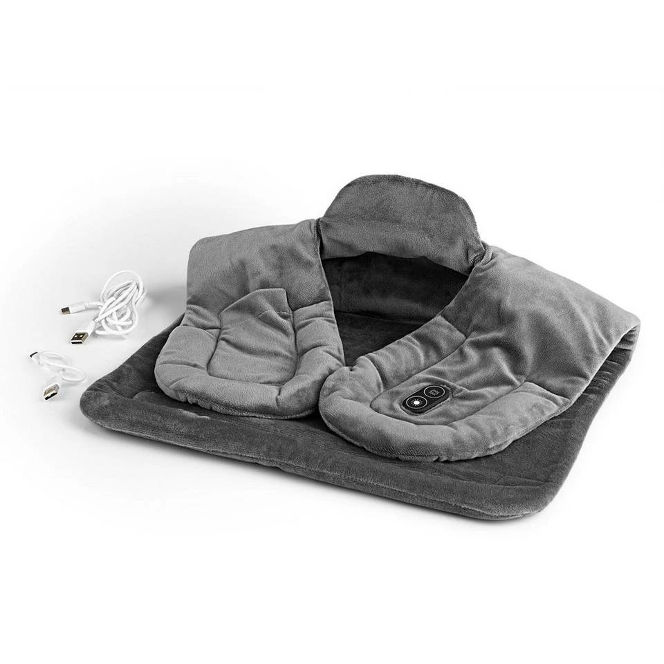 So geht Einkuscheln richtig! Mit der MAXXMEE Massage-Heizdecke gönnst du deinem Rücken, Nacken und den Schultern einen wohltuenden, wohlig warmen Entspannungsmoment. Einfach die aus weichem Fleece bestehende Decke auf die Schultern legen und mit Magnetverschluss verschließen. Die beschwerenden Enden sorgen für einen angenehmen Sitz und ein ausgleichendes Gefühl. Per integriertem Bedienfeld kannst du die Massage-Heizdecke komfortabel bedienen. Wähle zwischen 3 verschiedenen Massagemodi und 3 Heizstufen und sorge so für deine individuelle Wohlfühlmassage. Dank der zwei im Lieferumfang enthaltenen USB-Kabel bist du zudem besonders flexibel. Wähle das längere Kabel für die Anwendung zuhause und das kurze USB-Kabel mit einer Powerbank* für die flexible Anwendung unterwegs. Die extra Tasche in der Heizdecke bietet Platz zum Beispiel zum Verstauen der Powerbank*. Nach 45 Minuten schaltet sie sich zudem automatisch aus. Flexibel und einfach herrlich entspannend. Technische Details: Material: Fleece, Silikon Maße (L x B): ca. 40 x 66 cm Spannungsversorgung: 5 V DC, 10 Watt Schnittstelle: USB-C Heizstufen: 3 (40 °C, 50 °C, 55 °C) Vibrationsmodi: 3 (gleichmäßig / ungleichmäßig im Wechsel, gleichmäßig, ungleichmäßig) Abschaltautomatik: ca. 45 min Lieferumfang: 1x Massage-Heizdecke mit Bedienfeld, 2x USB-Kabel (1x 26 cm, 1x 180 cm) Hinweise: Das Gerät ist zum Erwärmen des Nackens, der Schultern und des Rückens sowie zur Vibrationsmassage der Nacken-/Schulterpartie bestimmt. Es ist kein Ersatz für eine medizinisch notwendige Behandlung. *Nicht im Lieferumfang enthalten.