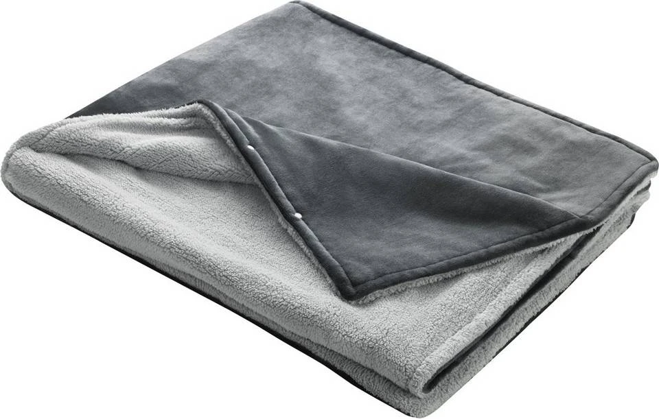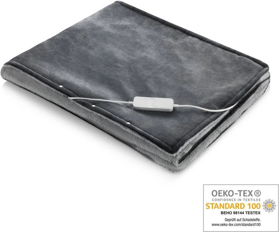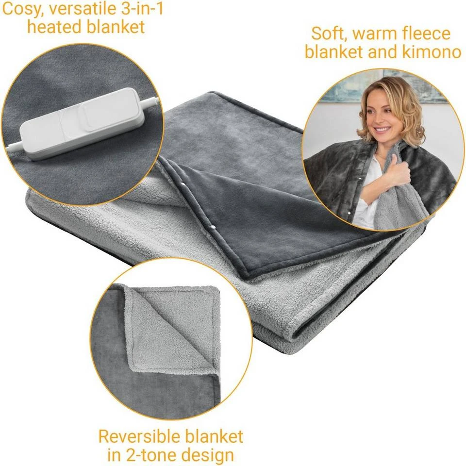 3in1 kuschelig beheizte und vielseitige Decke. Als Wärmedecke und Überwurf anwendbar. Auch ohne Wärmefunktion ein perfekter Begleiter für kalte Tage. 3 Temperaturstufen wählbar. Schnelles Aufwärmen mit 120 Watt . Weiche, warme Decke und Kimono aus Fleece. Gemütliche Größe: 160 x 130 cm . Angenehmes und weiches Material. Wärmendedecke in 2-farbigem Design. Sehr pflegeleicht und waschbar dank abnehmbaren Bedienelement ∙ Inkl. Sicherheitssystem: Überhitzungsschutz durch automatische Abschaltung.