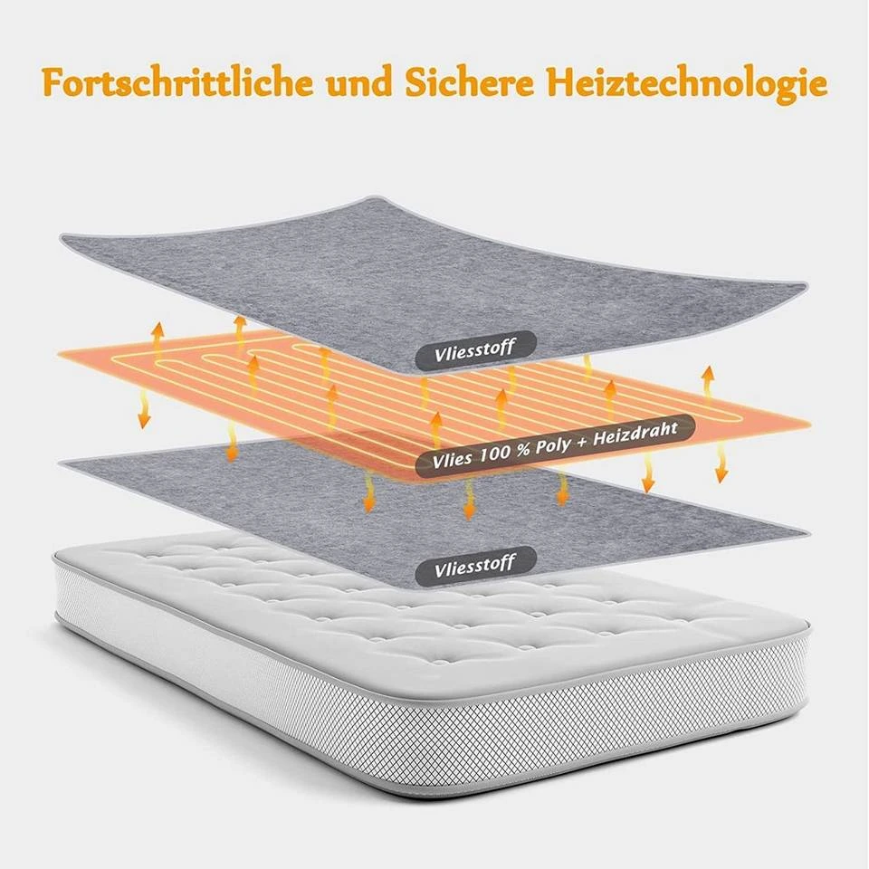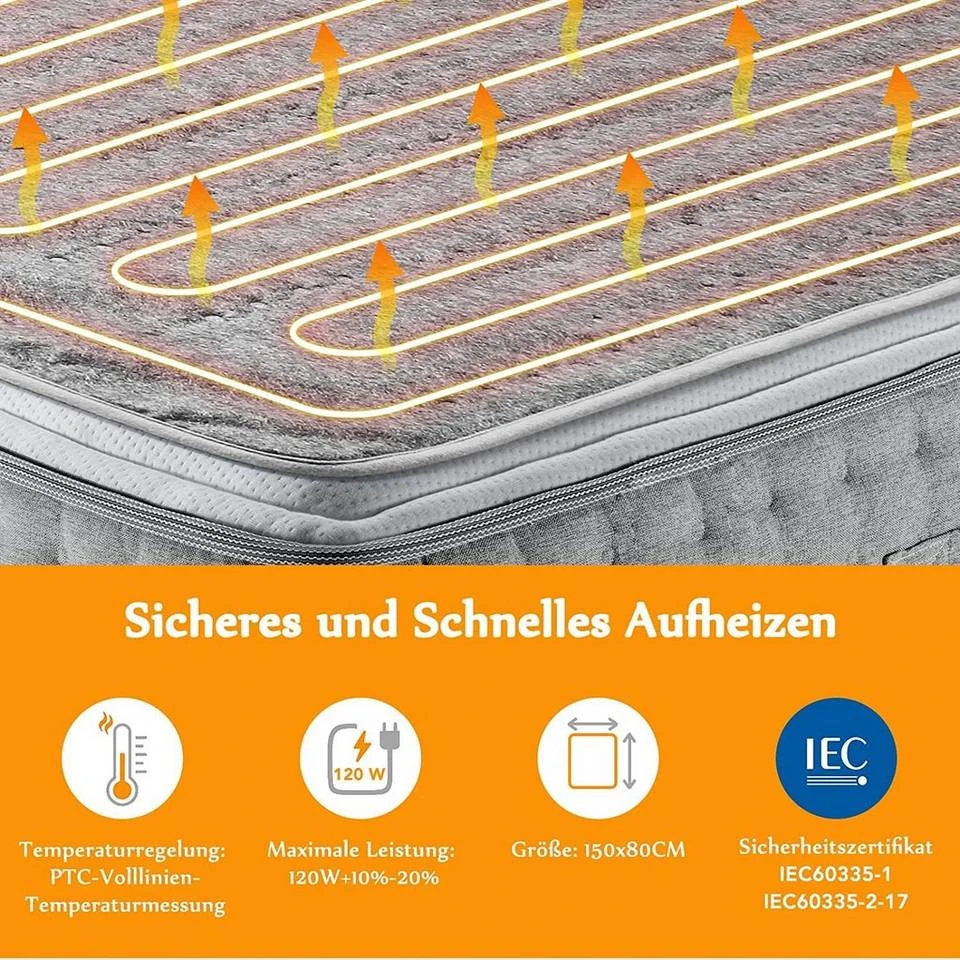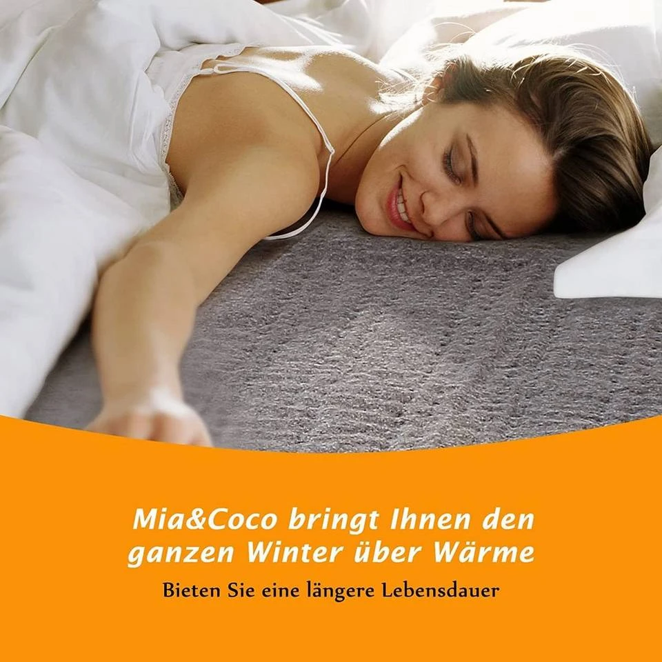 Größe: 150x80cm 1) 150 x 80 cm Heizdecke unter dem Bett. Die elektrische Heizdecke von Mia&Coco heizt sich gleichmäßig auf und die Temperatur steigt schnell an. Sie ist eine gute Wahl für eine warme Nacht und einen angenehmen Schlaf, inklusive Riemen zur Befestigung am Bett. 2) Bequem und extrem langlebig Wärmeunterbett mit abschaltautomatik ist aus 100% Polyestermaterial, langlebig und strapazierfähig genug, um das ganze Jahr über verwendet zu werden. 3) 10 Temperaturstufen, 9 Stunden Auto-Off-Timer für Sicherheit und Energieeinsparung Über den Controller erhalten Sie 10 Optionen für die Zieltemperatur von 1, 2 bis 9 und H (30 °C bis 53 °C) , und mit dem Timer können Sie Stunden zum Abschalten einstellen. 4) Sicher zu verwenden mit IEC-Zertifikat Hergestellt in Japan, mit PTC-Technologie erkennt der Heizdraht im Inneren der Decke die Temperatur in Echtzeit, hält so die vorgegebene Temperatur und verhindert eine Überhitzung. 5) Maschinenwaschbar Sie können die Kordel abnehmen und diese Decke von Hand oder maschinell waschen, indem Sie die Anleitung im Benutzerhandbuch befolgen. Das 150 x 80 cm große wärmeunterbett heizt sich schnell auf, um eine warme und sichere Schlafumgebung zu schaffen und Ihr Wohlbefinden zu steigern! Produktspezifikationen: (1) Leistungsspezifikation: 230 VAC/50 Hz (2) Größe: 150 x 80 cm (3) Oberflächenmaterial: 100 % Polyester (4) Maximale Leistung: 120 W + 10 % -20 % (5) Temperatur einstellbar: 1 bis 9 und H (30 °C bis 53 °C) 10 Stufen (6) Automatischer Abschalttimer: Einstellbar von 1 bis 9 Stunden. Wenn die Zeit abgelaufen ist, schließt sich die Decke automatisch ***BITTE BEACHTEN: Bitte verwenden, wenn das Wärmeunterbett trocken ist.